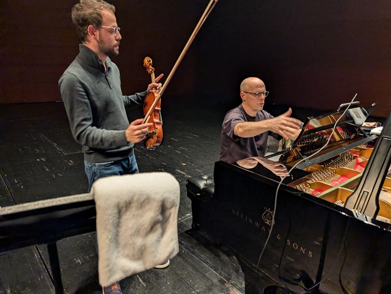 私は絶対に紙が好きなんですが、しかし世の中デジタルは楽譜の世界にも進んでいておりまして、ヤメン・サーディとジュリアン・カンタンは2人ともiPadで演奏しておりましたね。リハーサル中に充電させてくれ、ってステージ上にコードを伸ばしていただいて。こんな感じ↓