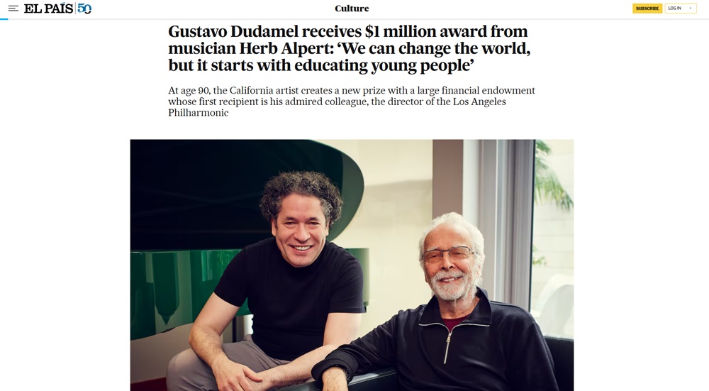 アルパートはこれまでも毎年5人のアーティストの75,000ドルを授与するなど、多額のお金を音楽家たちに支援するなどしてきたが、今回あらたに巨額の賞を創設。賞金100万ドル。日本円にすると1億5600万円ぐらい。この第一回目の受賞者として、アルパートの友人であり、音楽への情熱、こども達への支援といった意味で意見をともにするドゥダメル、そしてドゥダメル財団に与える。使い道は自由。
