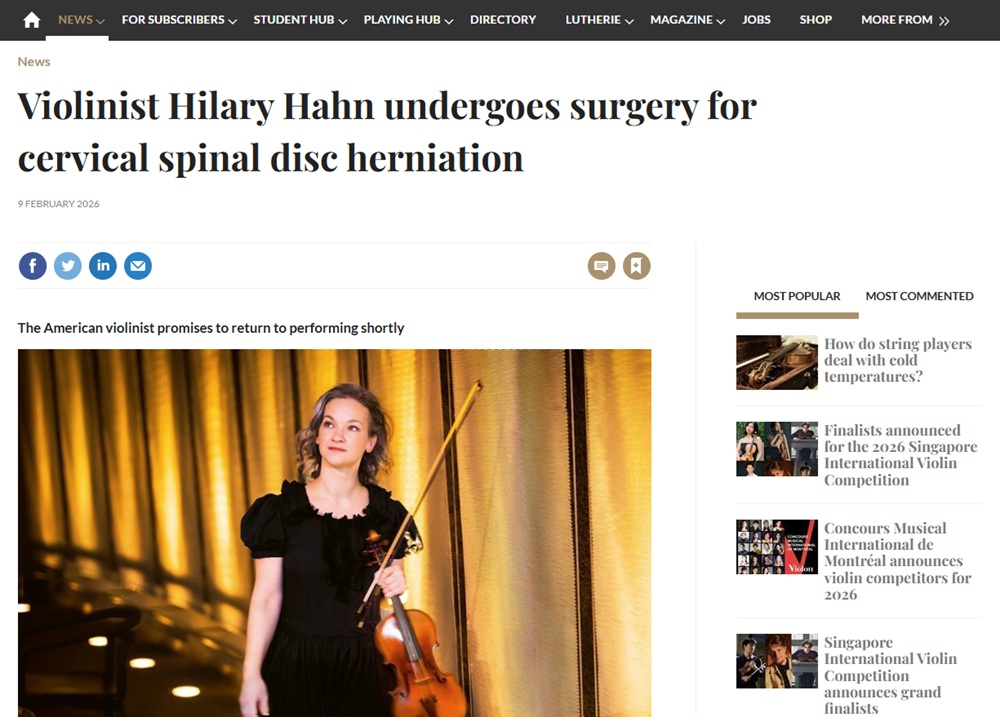 アメリカを代表するヴァイオリニストの一人、ヒラリー・ハーンはしばらく調子が悪く、コンサート活動から遠ざかっていました。2024年7月から25年2月まで、そして8月から現在までずっと、と、長期にわたっており、今後の活動が心配されていましたが、本人がコメントをSNSで発表。頸椎椎間板ヘルニア、つまり首の椎間板が痛んでいる状態だったとのことで、先日手術を受け(しかももとヴァイオリニストの外科医だったとのこと)、無事に成功したようです。