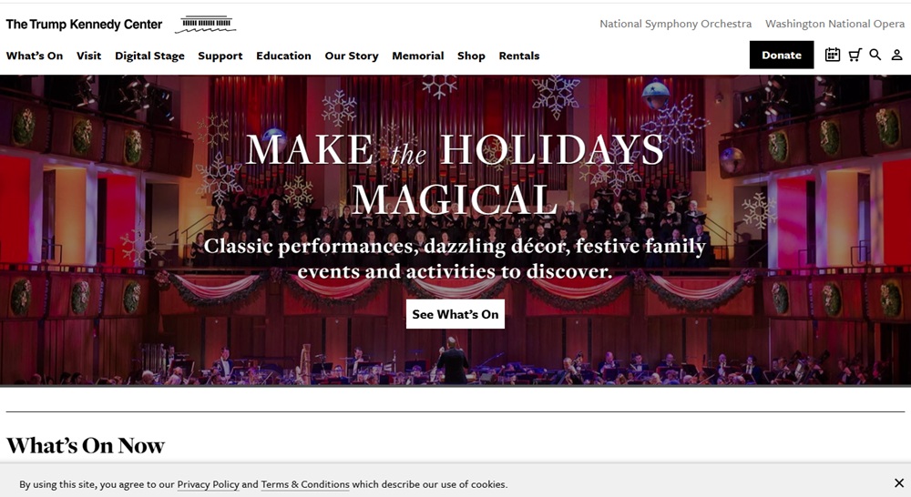 すでにあちこちで報道されているとおり、自分の名前をジョンの上に付け加えたのである。しかもすでに建物には修正を施し済み。ウェブサイトも「ザ・トランプ・ケネディ・センター」となっている。すごい。トランプが先だ。こういうときは通常、どちらが先で後かでもものすごく揉めるもんだが大丈夫ですか。全会一致で名称変更が決まったと公表されていますが、反対票に投じようとしたら反対ボタンが押せないような仕組みになっていたという情報もあり、もしそれが本当だとしたら。メーク・ホリデイズ・マジカルとか言っている場合ですか。