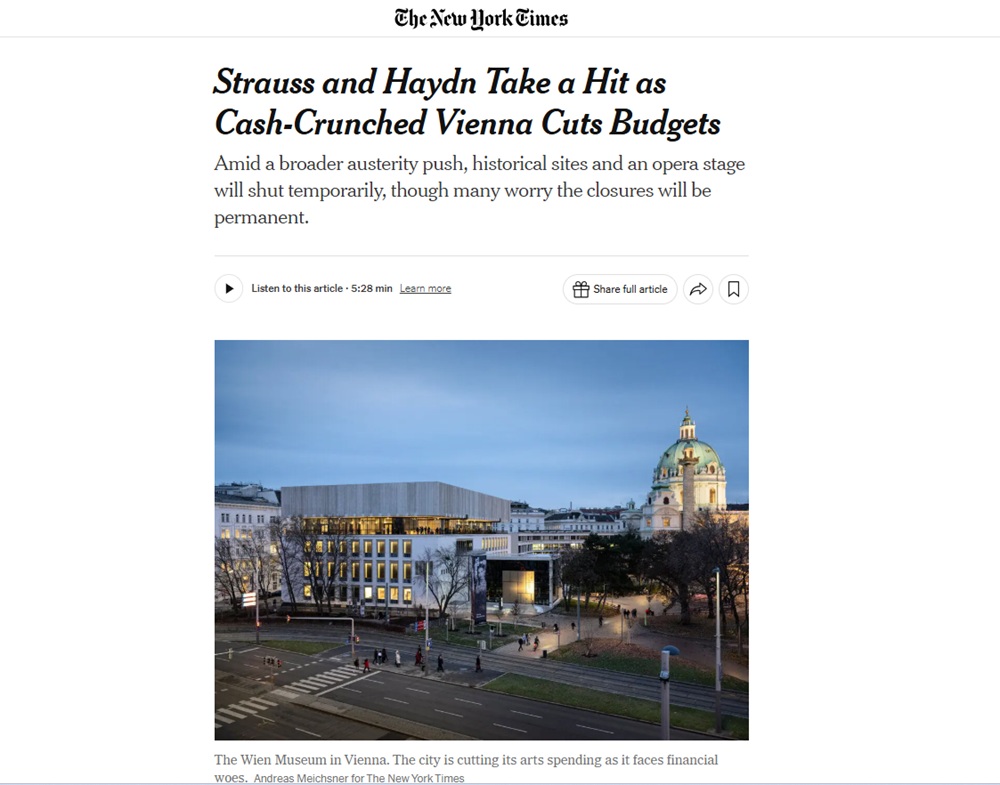 ウィーン市はアン・デア・ウィーン劇場を含む複数の劇場への予算を500万ユーロカット!ウィーン・フィルのサマーナイト・コンサート(シェーンブルン宮殿でやっているやつかな?)の助成金を25万ユーロカット!これはイベントの総費用の12%にもおよぶということなので、なかなか大打撃な感じがします。