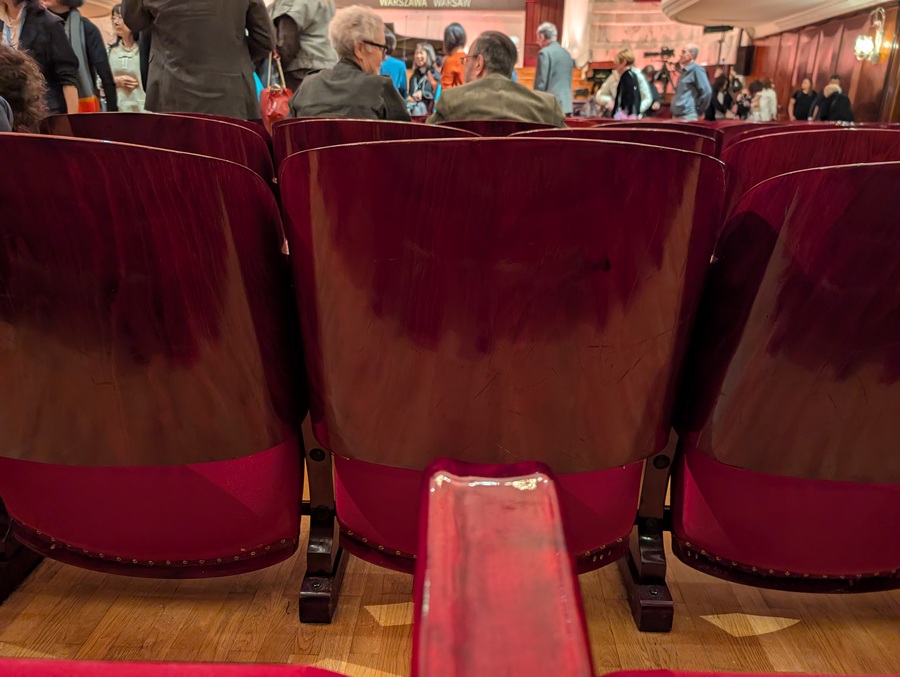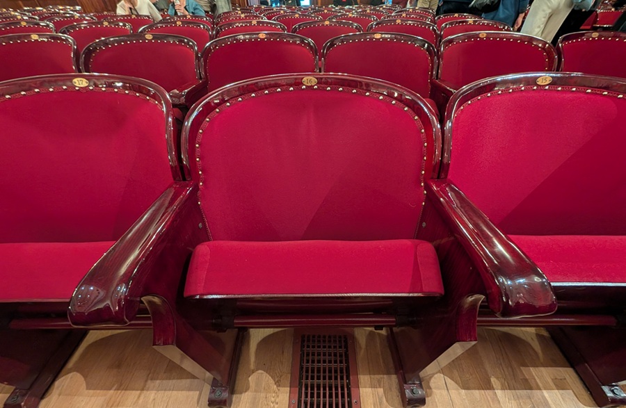 なんせ椅子、おっきいんですよ。後ろからみると包み込むような形をしている。座面も広い。左右のみならず前後も長いような気がする。ヨーロッパ人は同じ身長でも手足がアジア人より長いのが通常のようなので(ヨーロッパではホテルや空港などのトイレの座面も異様に高く感じることがあります)、これぐらいが適切、と言われればそうなのかもしれません。でもウィーンの楽友協会とかもっとギチギチ感があるので、これはヨーロッパのデフォルトというわけではないように思うのですが、どうでしょうかヨーロッパのコンサートホールに詳しい方々教えて。